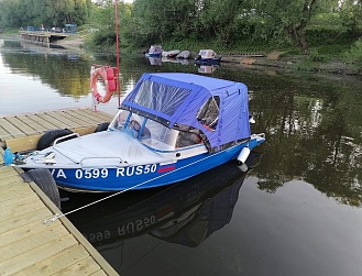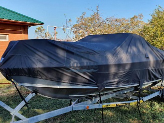Тент с задней дверью для выхода к мотору, небольшими боковыми окнами и усиленными краями для установки застёжек. Изготовлен из специализированной тентовой ткани Оксфорд 600 повышенной плотности
